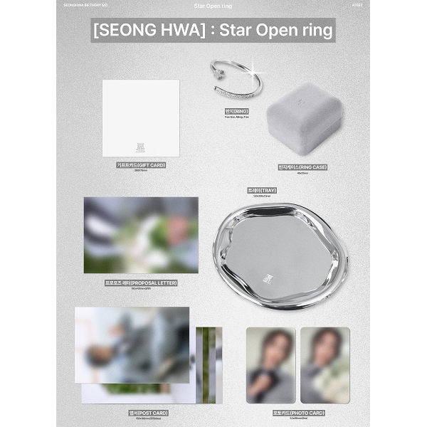 *RING : FREE SIZE*RING CASE : 4.6 x 5.1 cm*GIFT CARD : 28 x 7 cm*TRAY : 12 x 10 x 1.3 cm*PROPOSAL LETTER : 15 x 10 cm*POSTCARD : 15 x 10 cm / 6ea*PHOTOCARD : 5.4 x 8.6 cm / 2ea