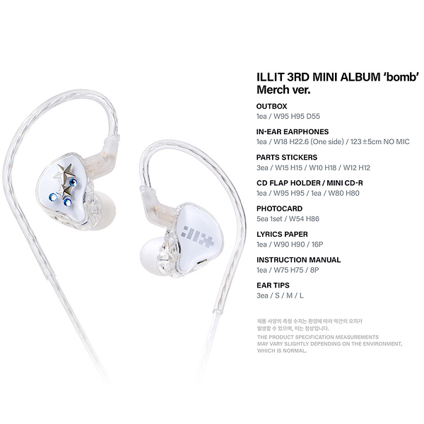 *OUTBOX : 9.5 x 9.5 x 5.5 cm*IN-EAR EARPHONE*PART STICKERS (3EA)*CD FLAP HOLDER + MINI CD-R*PHOTOCARD : 5.4 x 8.6 cm / 5ea*LYRICS PAPER : 9 x 9 cm / 16p*INSTRUCTION MANUAL : 7.5 x 7.5 cm / 8p*EAR TIPS (3EA)