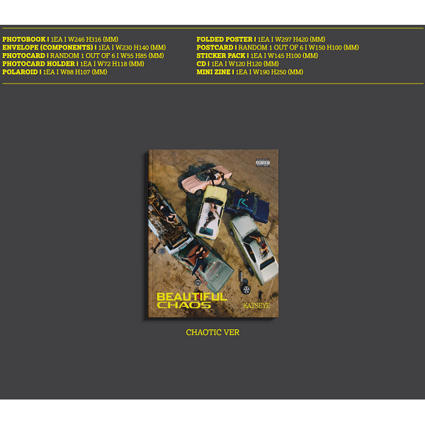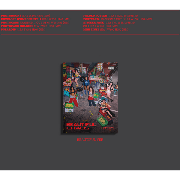 *PHOTOBOOK : 24.6 x 31.6 cm*ENVELOPE : 23 x 14 cm*PHOTOCARD : 5.5 x 8.5 cm / random out of 6*PHOTOCARD HOLDER : 7.2 x 11.8 cm*POLAROID : 8.8 x 10.7 cm*FOLDED POSTER : 29.7 x 42 cm*POSTCARD : 15 x 10 cm / random out of 6*STICKER PACK : 14.5 x 10 cm*CD*MINI ZINE : 19 x 25 cm