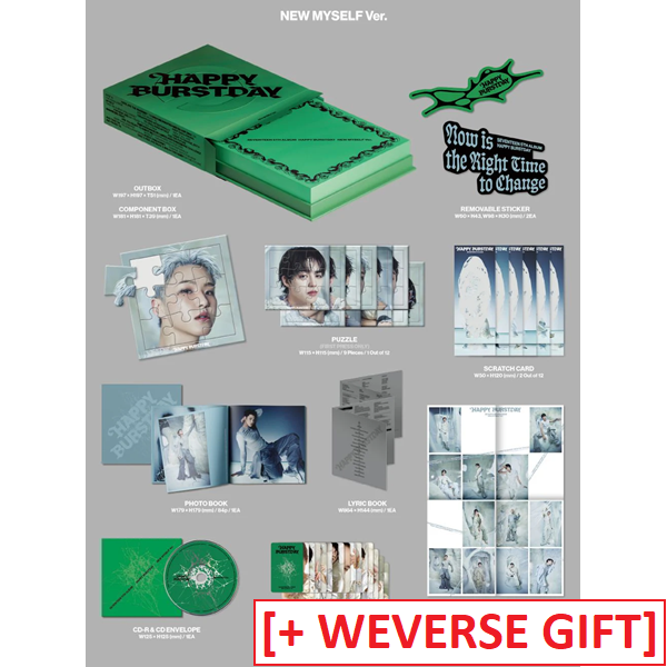 ---[NEW MYSELF (GREEN) VER.]---*OUTBOX : 19.7 x 19.7 x 5.1 cm*COMPONENT BOX : 18.1 x 18.1 x 3.9 cm*REMOVABLE STICKER : 2ea*PUZZLE : 11.5 x 11.5 cm / 9ea / random out of 12 / 1ST PRESS ONLY!*SCRATCH CARD : 5 x 12 cm / 2 random out of 12*POSTER : 25 x 35 cm*LYRIC BOOK : 86.4 x 14.4 cm*PHOTOBOOK : 17.9 x 17.9 cm / 84p*CD-R & ENVELOPE*PHOTOCARD : 5.5 x 8.5 cm / 4 random out of 48