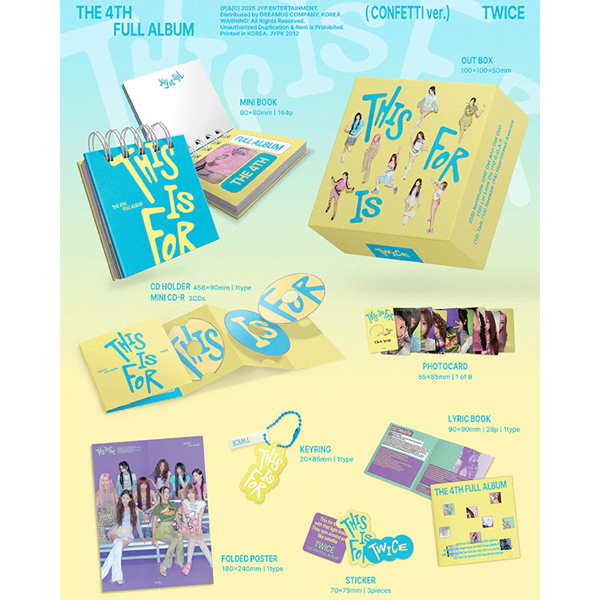 *OUTBOX : 10 x 10 x 5 cm*MINI BOOK : 8 x 8 cm / 164p*MINI CD-R + CD HOLDER*FOLDED POSTER : 18 x 24 cm*KEYRING : 2 x 8.5 cm*LYRIC BOOK : 9 x 9 cm / 28p*PHOTOCARD : 5.5 x 8.5 cm / random out of 9*STICKER : 7 x 7.5 cm / 3ea