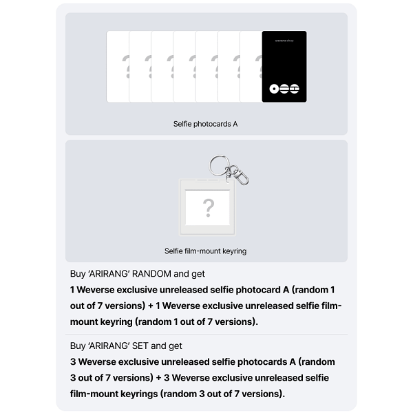 [WEVERSE GIFT] :-FOR ONE ALBUM : RANDOM WEVERSE SELFIE PHOTOCARD A (OUT OF 7) + RANDOM SELFIE FILM-MOUNT KEYRING (OUT OF 7)-FOR THE 2 ALBUM SET : 3 RANDOM WEVERSE SELFIE PHOTOCARDS A (OUT OF 7) + 3 RANDOM SELFIE FILM-MOUNT KEYRINGS (OUT OF 7)