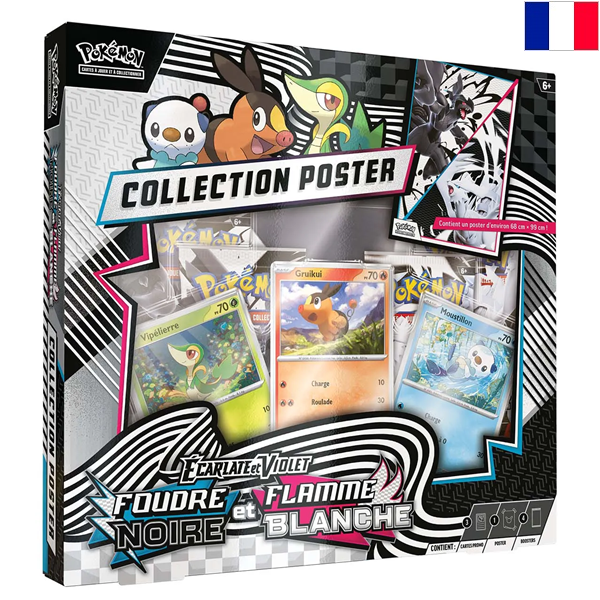 Contenu du coffret :*2 boosters Foudre Noire*2 boosters Flamme Blanche*3 cartes promotionnelles exclusives : Vipélierre, Gruikui et Moustillon*1 poster recto-verso grand format (68.26 x 99.06 cm / cartes et illustrations d’Unys)*1 carte à code pour le jeu pokemon live