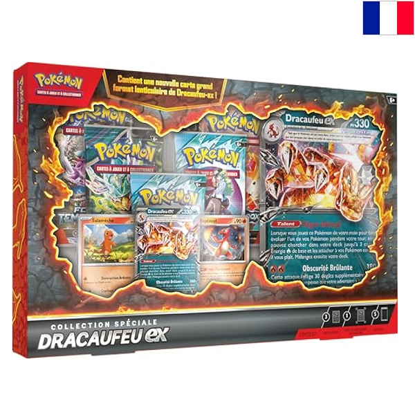 *1 carte promo en foil gravé avec Dracaufeu ex – Une carte au design époustouflant mettant en avant la puissance de Dracaufeu ex.*2 cartes foil avec Salamèche et Reptincel – Ajoutez l’évolution complète de Dracaufeu à votre collection, du tendre Salamèche au redoutable Reptincel.*5 boosters Pokémon TCG – Complétez votre collection avec une série de cartes surprises, parfaites pour étoffer votre deck.*1 carte lenticulaire surdimensionnée – Regardez Dracaufeu ex en action avec cette carte dynamique qui change selon l’angle de vue, rendant le Pokémon encore plus vivant.*Une carte code pour Pokémon TCG Live – Accédez à la version en ligne du jeu et défiez vos amis avec vos nouvelles cartes.