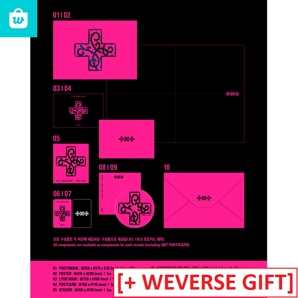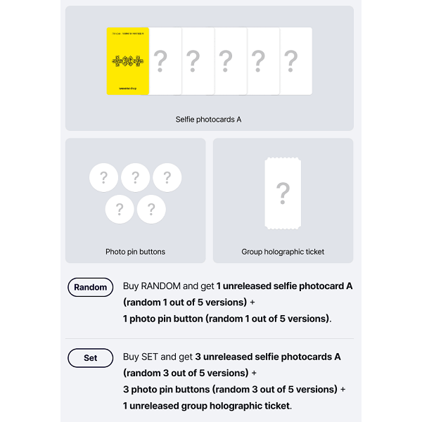 [WEVERSE GIFT] :-FOR ONE ALBUM : RANDOM PHOTOCARD (OUT OF 5) + RANDOM PIN BUTTON (OUT OF 5)-FOR THE ALBUM SET : 3 RANDOM PHOTOCARDS (OUT OF 5) + 3 RANDOM PIN BUTTONS (OUT OF 5) + GROUP HOLOGRAPHIC TICKET