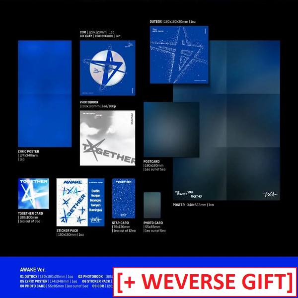 ---[AWAKE VER.]---*OUTBOX*PHOTOBOOK (100P)*POSTCARD (RANDOM OUT OF 5)*POSTER*LYRIC POSTER*STICKER PACK*STAR CARD (RANDOM OUT OF 12)*PHOTOCARD (RANDOM OUT OF 5)*CD-R & CD TRAY*TOGETHER CARD (RANDOM OUT OF 3)