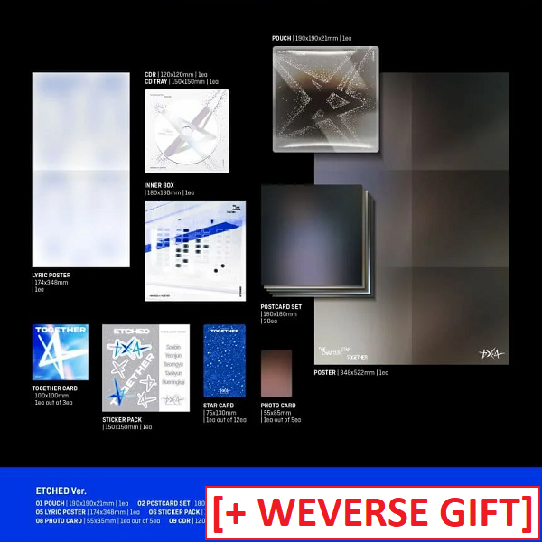 ---[ETCHED VER.]---*POUCH*POSTCARD SET (30EA)*INNER BOX*POSTER*LYRIC POSTER*STICKER PACK*STAR CARD (RANDOM OUT OF 12)*PHOTOCARD (RANDOM OUT OF 5)*CD-R & CD TRAY*TOGETHER CARD (RANDOM OUT OF 3)