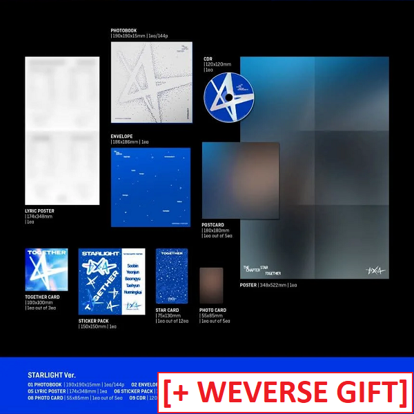 ---[STARLIGHT VER.]---*PHOTOBOOK (144P)*ENVELOPE*POSTCARD (RANDOM OUT OF 5)*POSTER*LYRIC POSTER*STICKER PACK*STAR CARD (RANDOM OUT OF 12)*PHOTOCARD (RANDOM OUT OF 5)*CD-R*TOGETHER CARD (RANDOM OUT OF 3)