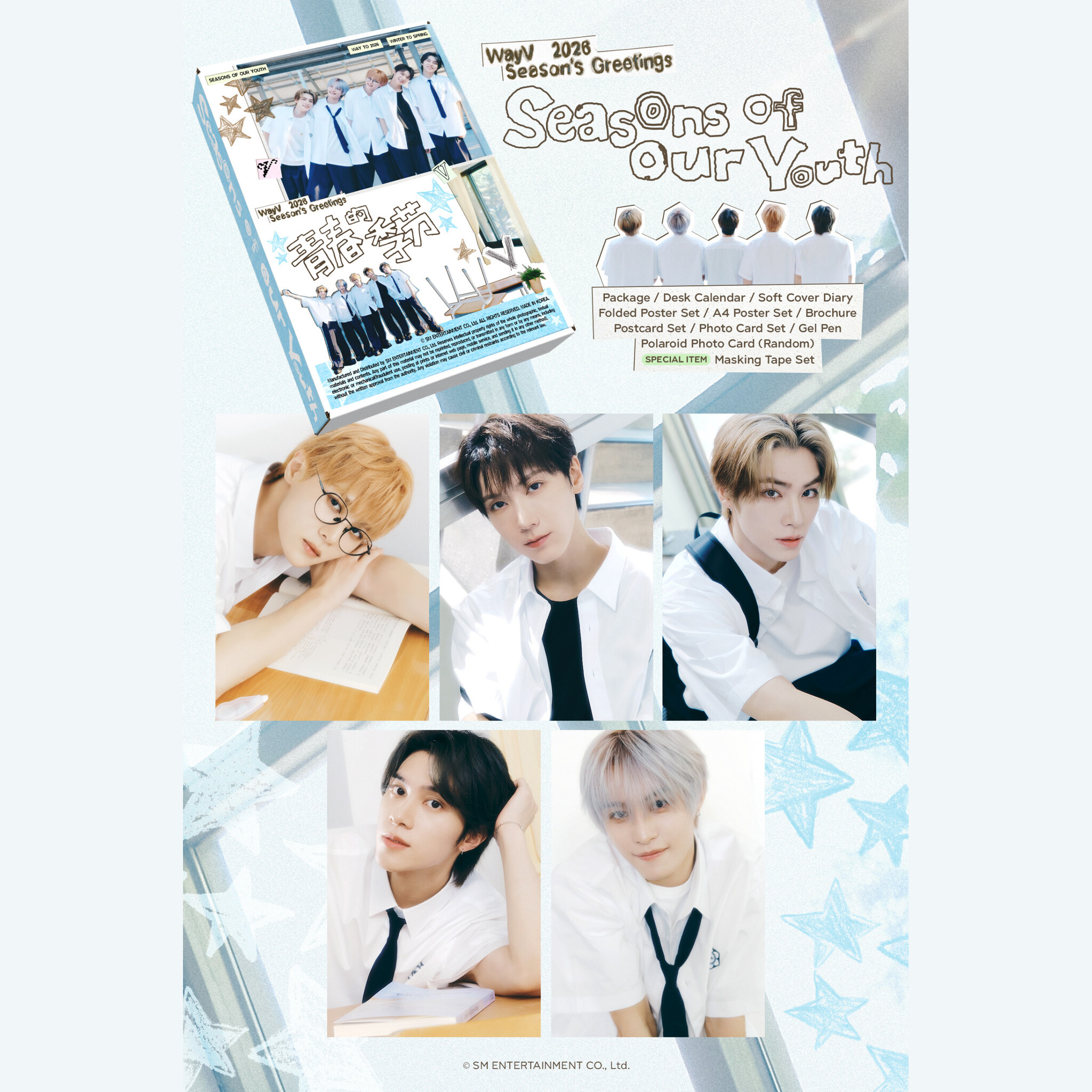 *Package : 215 X 311 X 53 mm *Desk Calendar : 170 X 230 mm / (14p)*Soft Cover Diary : 148 X 210 mm / (120p)*Folded Poster Set : 287 X 400 mm / 2pcs*A4 Poster Set : 200 X 287 mm / 11pcs*Brochure : 174 X 233 mm / (14p)*Postcard Set : 102 X 160 mm / 10pcs*Photo Card Set : 55 X 85 mm / 11pcs- Paper Holder : 80 X 108mm / 1pc- Photo Card : 55 X 85mm / 5pcs- Selfie Photo Card : 55 X 85mm / 5pcs*Gel pen : 14cm / 1pc*Polaroid Photo Card (Random) : 88 X 107 mm / 1pc*(SPECIAL) Masking Tape Set- Tape Case : 10.9 X 7 X 1.7cm / 1pc- Masking Tape : 1.2 X 1,000cm / 2pcs