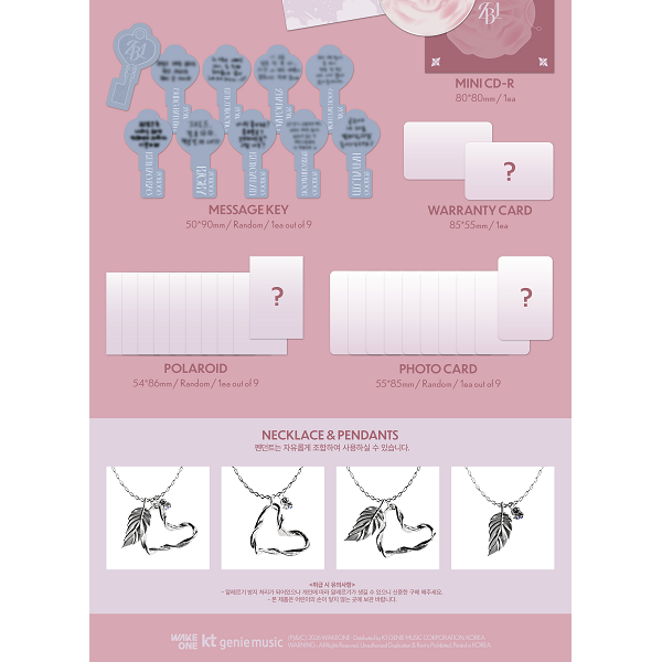 *OUTBOX*NECKLACE & PENDANTS (3EA)*SQUARE PHOTO PACK (30SHEETS)*MINI CD-R*MESSAGE KEY (RANDOM OUT OF 9)*WARRANTY CARD*POLAROID (RANDOM OUT OF 9)*PHOTOCARD (RANDOM OUT OF 9)