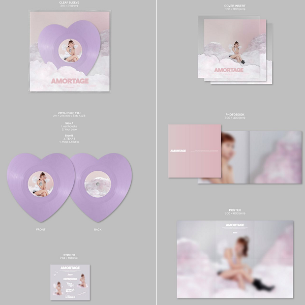 *CLEAR SLEEVE : 31.6 x 31.6 cm*VINYL (HEART VER.) : 27.1 x 27.4 cm*STICKER : 20.4 x 18.4 cm*COVER INSERT : 30 x 30 cm*PHOTOBOOK : 30 x 30 cm*POSTER : 90 x 60 cm