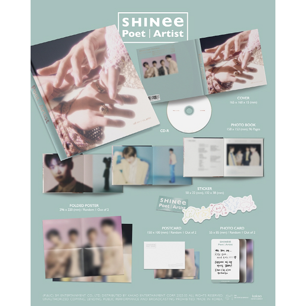 *COVER : 16.5 x 16 x 1.5 cm*CD-R*PHOTOBOOK : 15.8 x 15.3 cm / 96p*STICKER : 2ea*FOLDED POSTER : 29.6 x 22 cm / random out of 2*POSTCARD : 15 x 10 cm / random out of 2*PHOTOCARD : 5.5 x 8.5 cm / random out of 2